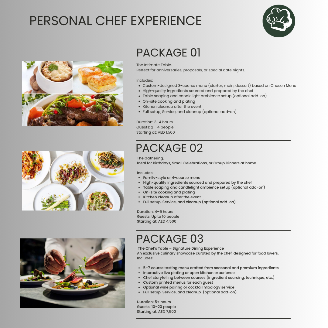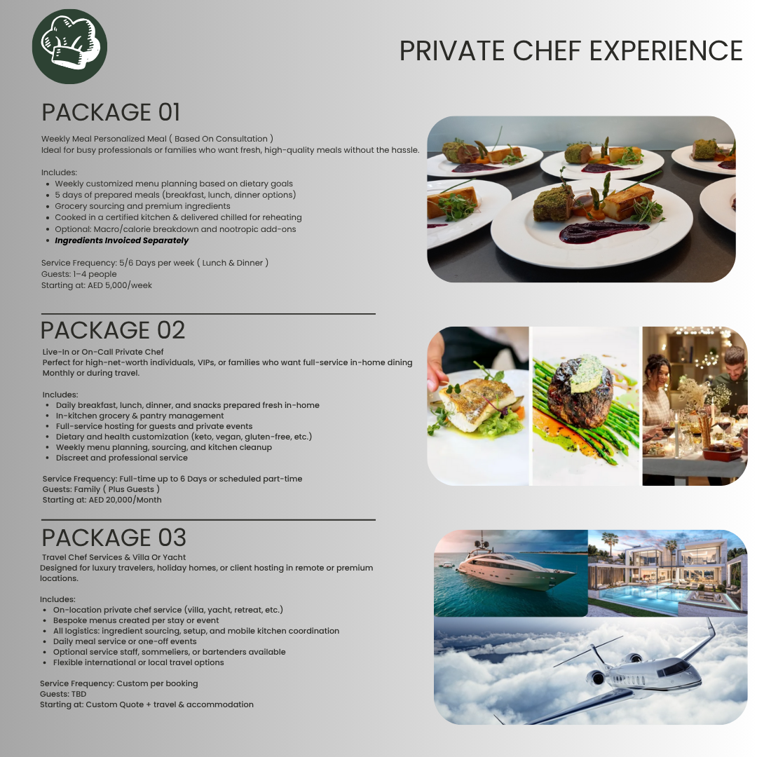 Private Chef service offers bespoke culinary experiences tailored precisely to your needs. You can choose from flexible engagement options such as By Trip, for gourmet dining during your travels at a villa, yacht, or private residence; By Month, for consistent, personalized meals throughout a specific period; or Long Term, to secure a dedicated private chef for continuous culinary excellence seamlessly integrated into your lifestyle.